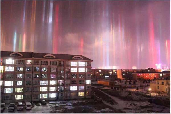 Một cảnh tượng lạ kỳ xuất hiện vào tối 26/12 khiến mọi người đều nghĩ rằng "người ngoài hành tinh đổ bộ" về đây. Các cột trụ ánh sáng đa sắc xuất hiện ở khu tự trị Nội Mông, Trung Quốc tạo nên cảnh tượng đẹp mắt chưa từng có. Dân chúng đổ xô ra ngoài trời quan sát.