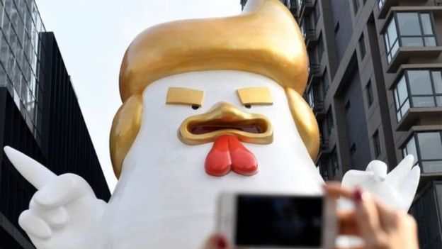 Với lịch của người Trung Quốc thì năm sau là năm con gà. Những bức tượng về các chú gà đang được người dân làm. Một bức tượng chú gà khổng lồ chào đón năm mới được làm nhờ cảm hứng từ hình tượng ông Trump.