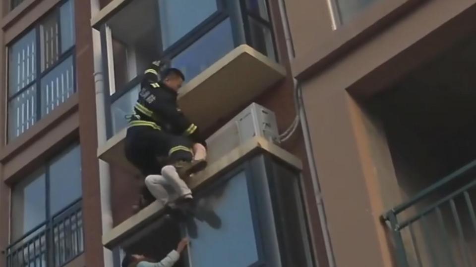 Mọi chuyện chưa dừng lại ở đó. Cô gái suýt nữa tuột khỏi vòng tay của lính cứu hỏa. Anh phải rất khó khăn để giữ chặt cô gái.