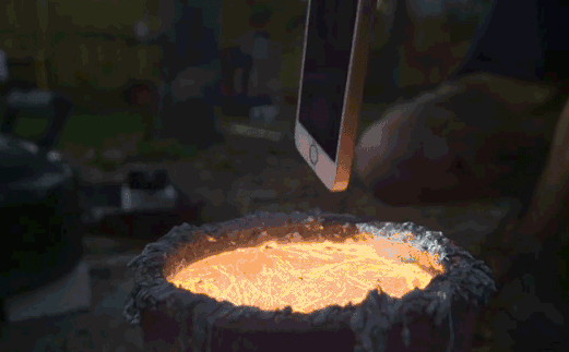 Gần như ngay lập tức sau, chiếc iPhone đã bị biến dạng khi tiếp xúc aluminum. Mặt trước của máy đã biến thành than đen thui và mặt sau thì chuyển thành màu cam, bạn có thể thẩy lửa bốc lên ngay khi điện thoại được cho vào. Ít lâu sau, chiếc iPhone đáng thương gần như đã tan chảy hoàn toàn trong aluminum.