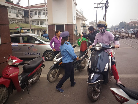 Có mặt tại khu vực này, hai nữ nhân viên gác nhau thay phiên sau mời những người điều khiển xe máy có ý định vào bên trong BV tới gửi xe. Bãi gửi được bố trí ngay sát với trạm gác và đường ray tàu hỏa.