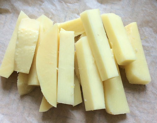 Bước 1: Đồ nấu kèm là măng củ cắt miếng bằng ngón tay cái rồi đem luộc kỹ với nước có thả chút muối ít nhất là 3 lần trước khi đem chế biến.