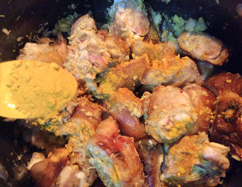 Bước 4: Trong lúc xào bạn thêm 1 thìa con bột nghệ để món giả cầy của bạn có màu vàng đẹp nha!