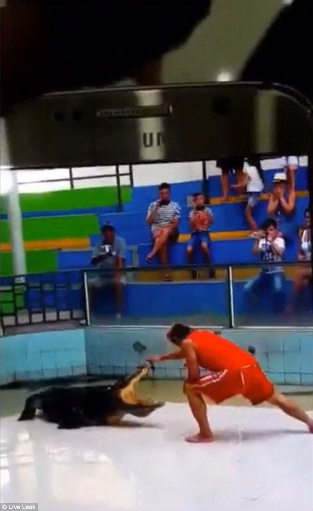 Huấn luyện viên Anusak đã bị tấn công khi đang huấn luyện chú cá sấu to lớn.