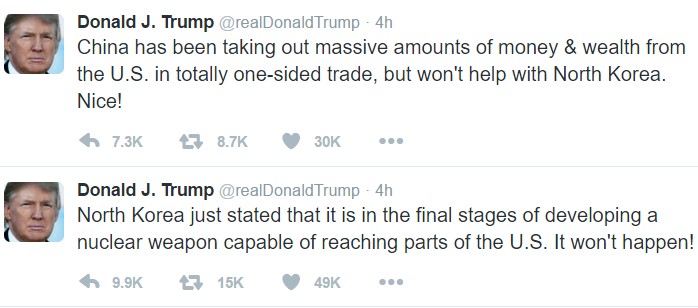 Trong bình luận đầu tiên, ông Trump đã đáp lại lời phát ngôn của nhà lãnh đạo Triều Tiên Kim Jong Un đăng hôm cuối tuần rằng chính phủ Triều Tiên đang hoàn tất công tác chuẩn bị cho một vụ phóng thử nghiệm một tên lửa đạn đạo xuyên lục địa. Đây có thể là bước đệm để Triều Tiên phát triển một loạt vũ khí hạt nhân có thể bắn tới địa phận của Mỹ.