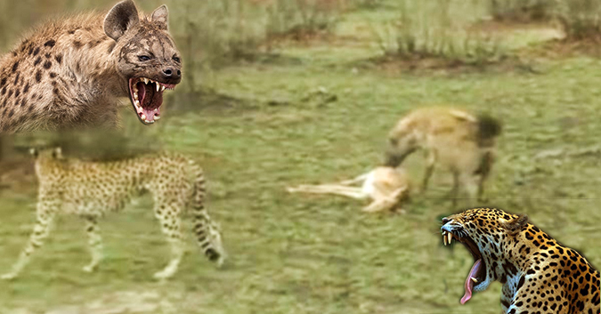 Trong đoạn video dưới đây, một con báo đốm sau khi phục kích thành công linh dương nhỏ bé thì lại bị kẻ ngáng đường xảo quyệt – linh cẩu tới giành giật con mồi.