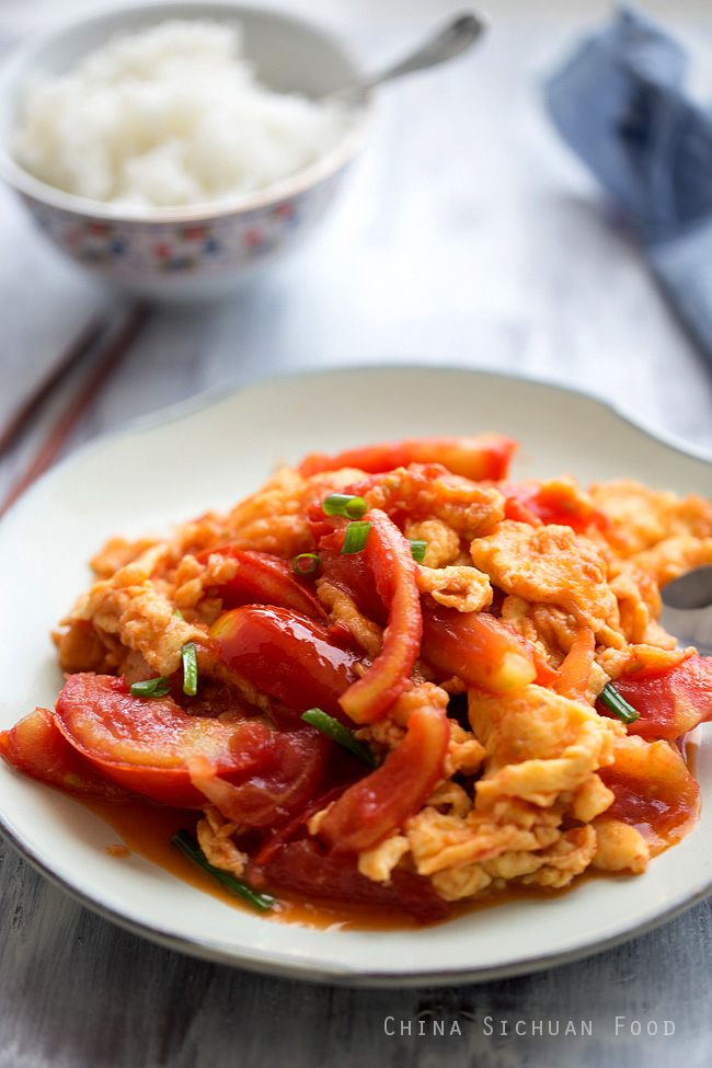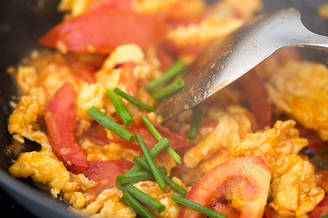 - Để trứng ra đĩa. Vẫn tiếp tục dùng chảo đã rán trứng để xào cà chua. Cà chua vừa chín tới thì cho trứng vào xào tiếp, nêm lại gia vị cho vừa miệng. Cho hành lá đã rửa sạch, thái nhỏ vào đảo trước khi tắt bếp.