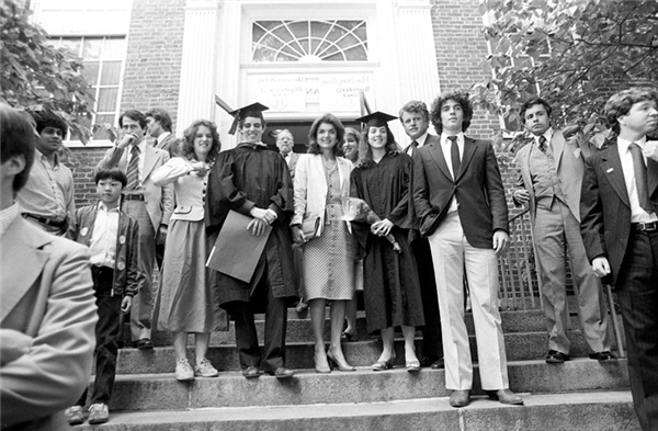 Caroline Kennedy đứng cùng mẹ là Jacqueline Kennedy Onassis (phải), anh trai John Jr. (trái) và người chú là Nghị sĩ Edward M. Kennedy (thứ hai từ trái sang) sau khi tốt nghiệp Đại học Harvard và ngày 5/6/1980, tại Cambridge, Massachusetts.