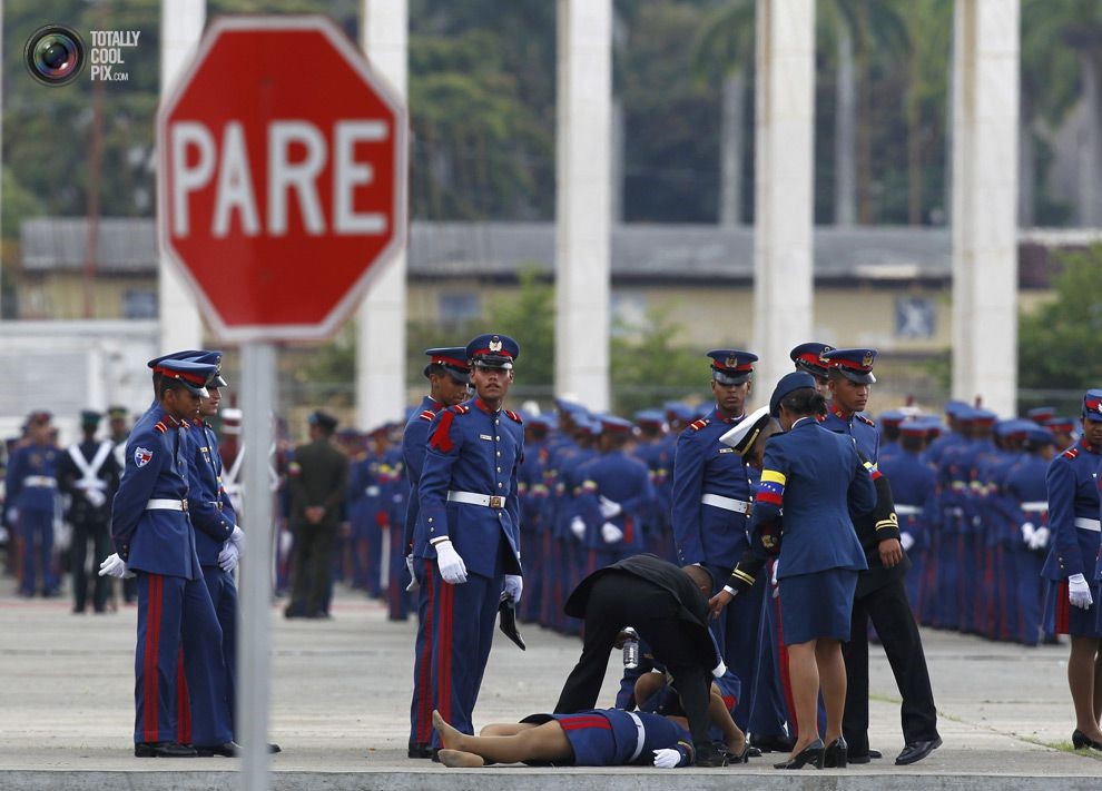 Một học viên sĩ quan bất ngờ ngã quỵ trước giờ diễu hành trong lễ tang Tổng thống Venezuela Hugo Chavez ngày 15/3/2013. Ảnh: Reuters.