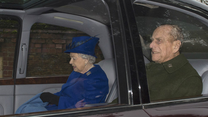 Nữ hoàng Elizabeth II cùng hoàng thân Philip sau khi tham dự buổi lễ nhà thờ ngày 8.1Reuters