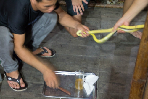 Con rắn đã chết, ông chủ kéo thẳng nó ra để đổ tiết đọng vào chén rượu, và cắt một đường nữa để dòng mật xanh chảy xuống một cốc rượu khác. Những cô gái cũng reo hò khi Alex cắn quả tim của một con rắn khác, môi họ chúm lại như vừa ghê sợ vừa chực cười lo lắng.