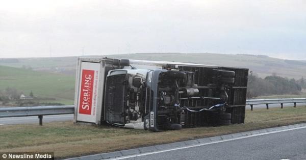 Một chiếc xe tải bị thổi bay, lật đổ giữa đường ở Castleton, Anh