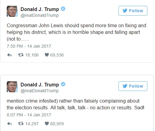 Vài ngày trước ngày lễ tôn vinh lãnh tụ dân quyền Martin Luther King, Jr., Donald Trump đả kích Dân biểu John Lewis sau khi huyền thoại từng sát cánh với Mục sư King nói rằng ông không xem ông Trump là "tổng thống chính danh" vì điều mà ông tin là những nỗ lực của Nga giúp ông Trump thắng cử.