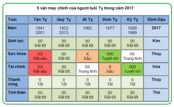 - Kỷ Tỵ (1929, 1989): Ít lý do để lo lắng về sức khoẻ. Năm nay nói chung sẽ thuận buồm xuôi gió.