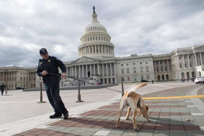 Một sĩ quan cảnh sát hôm 18/1 dắt chó nghiệp vụ đi tuần tra gần Tòa nhà Quốc Hội.