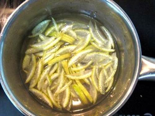 Bước 1: Vỏ bưởi sau khi ngâm nước muối, bạn vớt ra và để ráo. Sau đó, cho vỏ bưởi vào nồi, đổ ngập nước và đun khoảng 10 phút cho sôi hoặc thấy có mùi thơm, vỏ bưởi mềm thì đổ nước ra bát tô. Bạn có thể dùng rây lọc để chắt lấy phần nước và bỏ phần vỏ bưởi sang một nồi sạch khác.