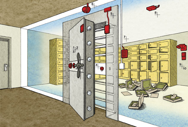 Gă bước vào thang máy, ấn số tầng vào một căn pḥng nhỏ cũng chính là sảnh dẫn tới kho chứa. Một cánh cửa thép 3 tấn với 6 lớp bảo mật hiện ra. Một bánh xe số với các con số từ 0 đến 99 và có khoảng 100 triệu khả năng kết hợp các bộ số cho ra mật khẩu.