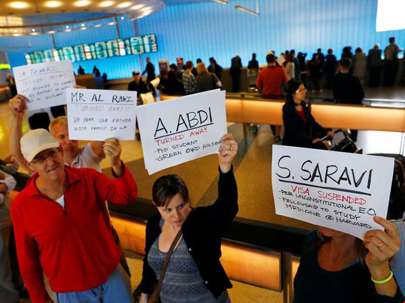 Sắc lệnh của Tổng thống Mỹ Donald Trump có hai nội dung chính là cấm nhập cảnh đối với công dân từ bảy nước Hồi giáo, đồng thời tạm hoãn tất cả chương trình tiếp nhận người tị nạn. Cùng những diễn giải không rõ ràng về việc cấm hay không cấm những công dân nước ngoài đã có thẻ xanh (cho phép thường trú tại Mỹ) được bước chân vào Mỹ, sắc lệnh đã gây ra nhiều tranh cãi về mặt pháp lý. Đến ngày 1-2, đã có bốn bang tại Mỹ bao gồm New York, Massachusetts, Virginia và Washington đã đệ đơn kiện sắc lệnh của ông Trump. Tổng chưởng lý bang New York Eric Schneiderman mô tả sắc lệnh là “vi hiến, bất hợp pháp và về cơ bản không phải nước Mỹ”.