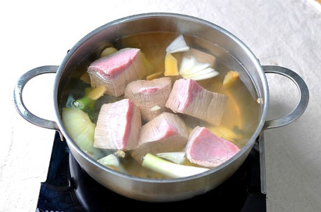 Hành tây bóc vỏ bổ đôi, gốc hành cắt khúc, tỏi bóc vỏ, gừng thái lát. Cho 2 lít nước vào nồi, thêm hành, tỏi, gừng, hạt tiêu vào đun sôi