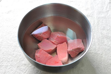 Bò rửa sạch cắt khúc dài 5cm. Ngâm thịt bò trong nước lạnh khoảng 30 phút.