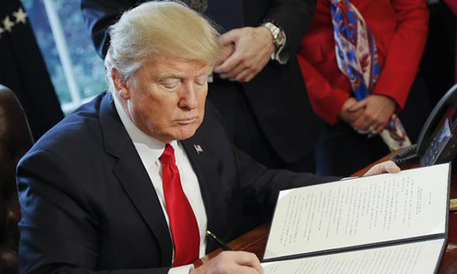 Tổng thống Mỹ Donald Trump ký sắc lệnh hành pháp. Ảnh: AP