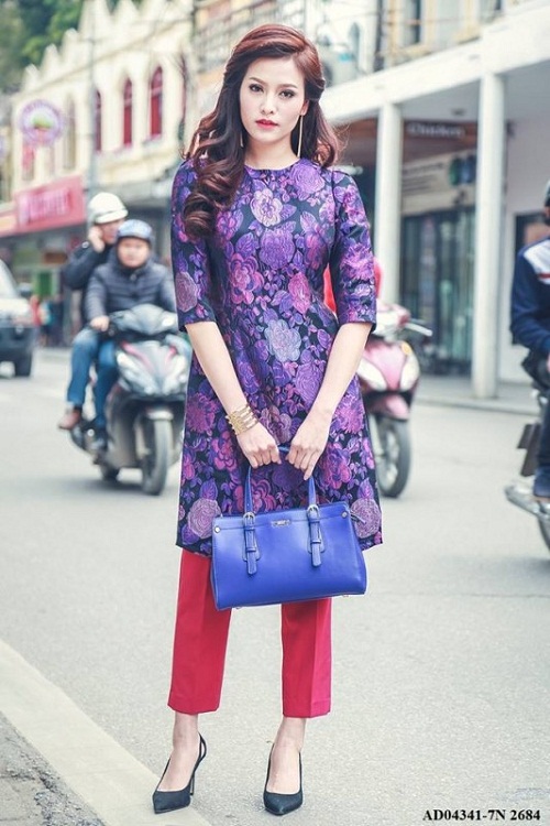 Áo dài cách tân tà ngắn kết hợp với quần tây ống nhỏ.
