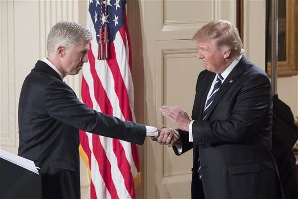 Hôm 31/1, sau khi được đề cử làm thẩm phán tòa án tối cao và kết thúc bài phát biểu, ông Neil Gorsuch quay sang bắt tay Tổng thống Donald Trump.