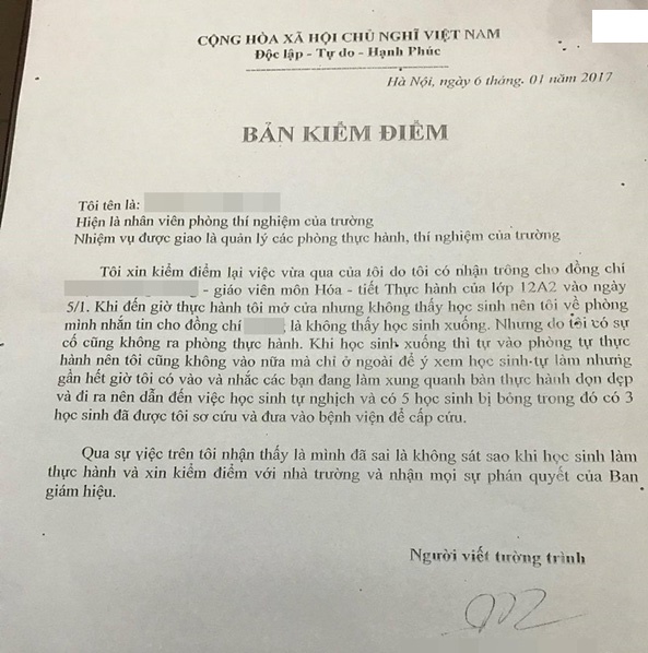 Kể lại sự việc, cô Mai A. cho biết, ngày 5/1, tiết thực hành Hóa do cô Phạm H.G. phụ trách tuy nhiên cô giáo này xin nghỉ nên nhờ mình trông hộ. Sau khi mở phòng giao hóa chất cho học trò, cô Mai A. để cho học sinh tự thực hành rồi ra ngoài.