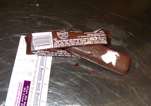 Những thỏi kẹo sôcôla này có dấu hiệu mềm bất thường, chúng có vẻ như dạng bột. Bóc thêm lượt nữa, một gói bột màu trắng bị lộ ra.