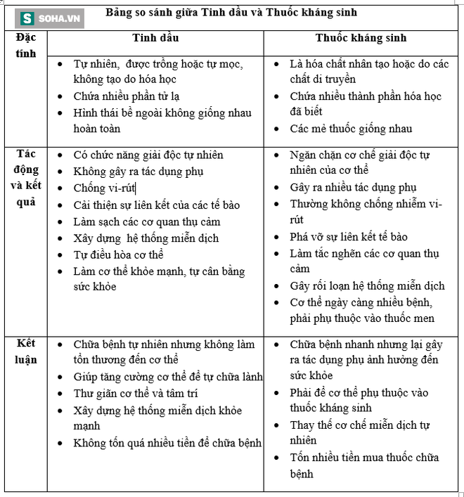 Ngày 13 tháng 4 năm 2013, báo Health Impact đã đưa ra một bảng so sánh tác dụng giữa tinh dầu và thuốc kháng sinh như sau.