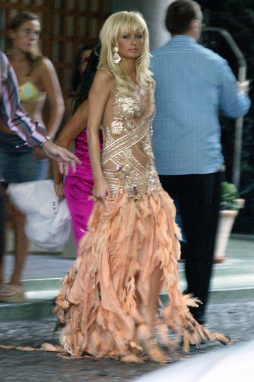 Kiểu thời trang sến súa đặc trưng của những năm 2004. Có vẻ như cô nàng rất thích những tông màu nổi như vàng hồng hay bảy sắc cầu vồng, rất tiếc là khi chúng kết hợp với nhau lại khiến da Paris tối đi và dìm cô nàng hẳn.