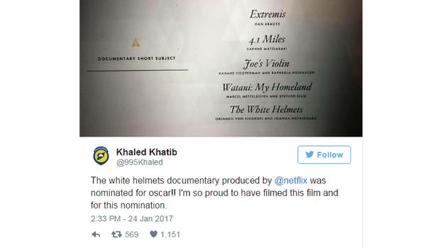Khaled Khatib viết trên twitter sau khi bộ phim tài liệu được đề cử giải Oscar
