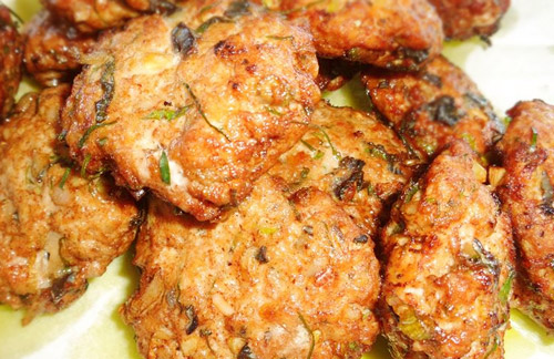 cho thịt đã vo viên vào chảo chiên vàng với lửa vừa. Khi thịt chiên vàng giòn thì gắp ra dĩa có lót giấy thấm dầu.