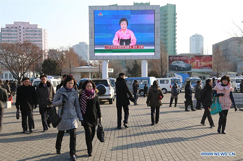 Người dân Bình Nhưỡng tụ tập gần một màn hình lớn ở ga tàu để nghe thông tin về vụ thử bom hạt nhân hồi tháng 1/2016. Ảnh: Xinhua
