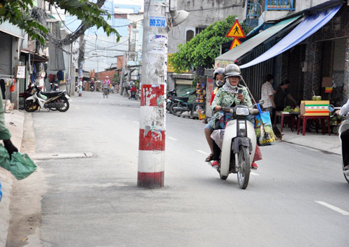 Ghi nhận tuyến đường dài khoảng 1km với hàng chục cây trụ điện án ngữ giữa đường, người đi xe máy muốn lưu thông phải lạng lách tránh hàng trụ điện này.