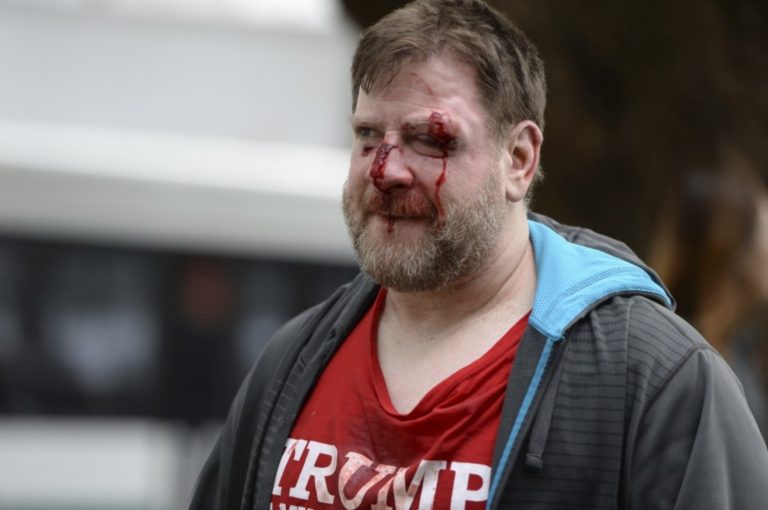 Trong một công viên tại thành phố Berkeley, ủng hộ viên TT Trump và phe chống đối đã dùng những cây gậy bằng gỗ để đánh vào đầu nhau, và ủng hộ viên của TT Trump còn xịt hơi cay vào cảnh sát trong trang phục chống bạo động đang đứng cách xa.
