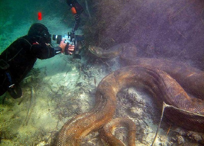 Được biết, loài vật bò sát trong bức hình chính là loài trăn Anaconda - 1 trong những quái vật khổng lồ và hung bạo nhất hành tinh.