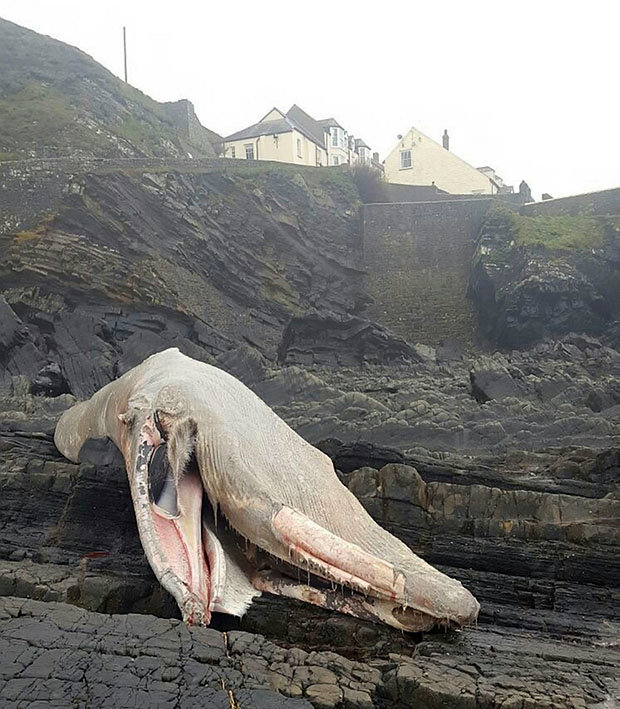 Những người dân địa phương gần Hartland Quay ở Devon, Anh đã trình báo với chính quyền về một sinh vật khổng lồ đã chết trôi dạt vào bờ biển. Sinh vật này trông giống như cá voi.