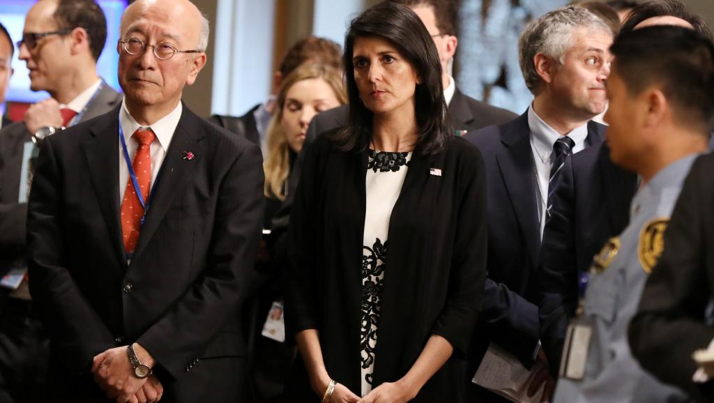 Đại sứ Mỹ tại Liên Hiệp Quốc bà Nikki Haley và đại sứ Nhật Koro Bessho (T) sau phiên họp Hội Đồng Bảo An Liên Hiệp Quốc về Bắc Triều Tiên ngày 08/03/2017.