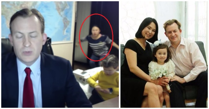 Ông Robert Kelly, giáo sư quan hệ quốc tế tại Đại học Pusan, đang có cuộc phỏng vấn nghiêm túc với BBC về tình hình tại Hàn Quốc sau vụ phế truất Tổng thống Park Geun-hye. Đột nhiên, các con ông bước vào phòng và lọt vào màn hình phỏng vấn. Ông Kelly lúng túng xin lỗi trong khi một phụ nữ châu Á hốt hoảng chạy vào và kéo hai em bé ra ngoài.