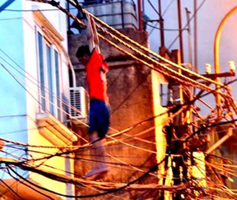 Khoảng 18h tối 19.4.2016, tại đường Khương Đình, phường Hạ Đình, quận Thanh Xuân (Hà Nội), nhiều người dân đã nín thở chứng kiến nam thanh niên mặc áo phông màu đỏ, quần cộc chạy nhảy, đu leo trên đường dây điện có độ cao cách mặt đất 3,5 mét.
