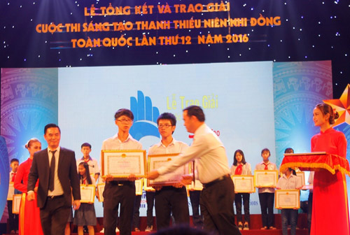 Huy (bìa phải) và Khoa nhận giải Khuyến khích quốc gia tại cuộc thi Sáng tạo thanh thiếu niên, nhi đồng toàn quốc 2016. Ảnh: NVCC.