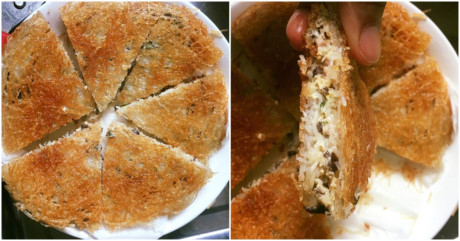 - Bắc chảo lên bếp và đổ dầu, khi dầu nóng, rải 1 lớp miến kín mặt chảo (chảo nhỏ, đường kinh 20cm). Tiếp theo cho 1 lớp nhân thịt dàn đều, khoảng 5 phút sau cho tiếp 1 lớp miến rải đều phủ kín mặt nhân, đun nhỏ lửa khoảng 10 phút, rồi dùng đũa lật. Đợi miến chín vàng 2 mặt thì gắp ra, để vào giấy thấm dầu.