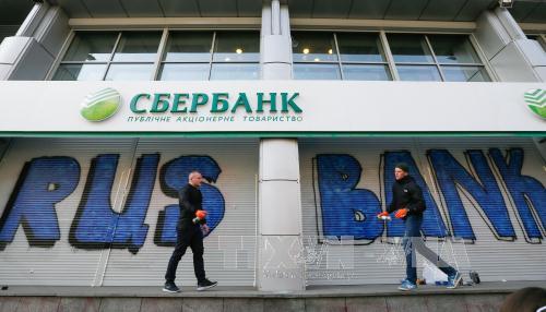 Chi nhánh ngân hàng Sberbank của Nga tại Kiev, Ukraine ngày 13/3. Ảnh: EPA/TTXVN