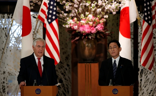 Ngoại trưởng Rex Tillerson trong cuộc họp báo với người đồng cấp Nhật Fumio Kishida tại Tokyo. Ảnh: Reuters