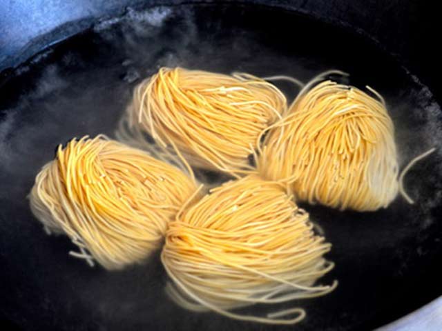 Bước tiếp theo, khi thấy mì hơi săn, cho thịt gà đã thái vào chảo.