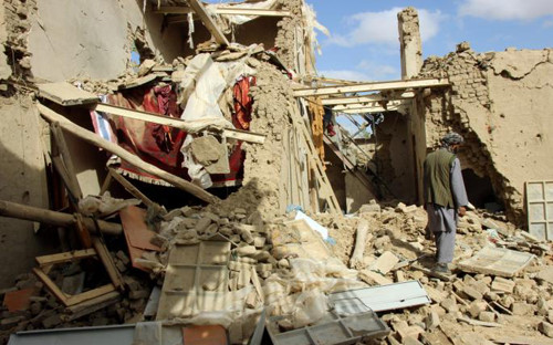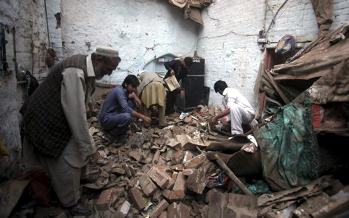 Người dân Afghanistan thu nhặt đồ đạc sau khi căn nhà của họ bị phá nát vì một cuộc tấn công. (Ảnh: AFP)