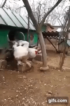 Trong video, con gà màu trắng lao ra từ trong chuồng xuống đất. Con gà to, hai chân lớn, sải cánh khá rộng. Nếu chú ý, bạn sẽ nhận ra vẫn còn một con gà to tương đương đang ẩn nấp ở dưới gầm nữa kìa.