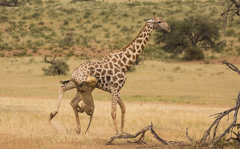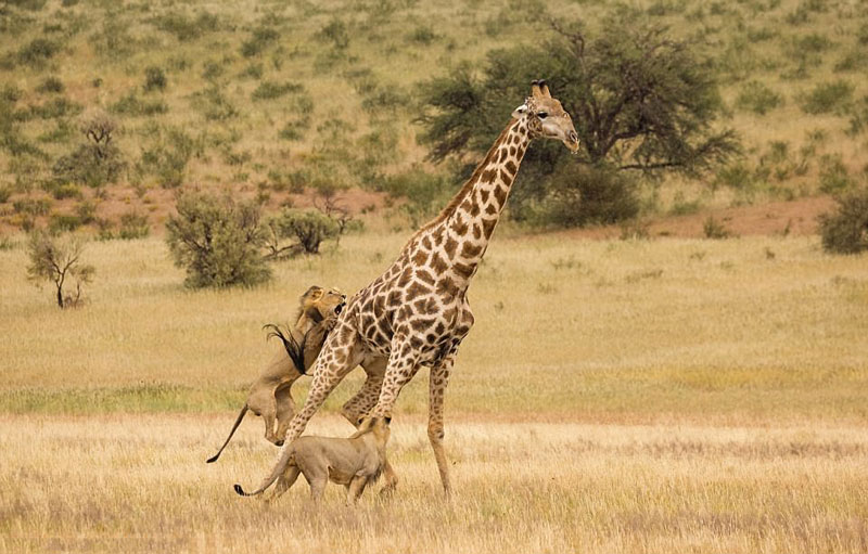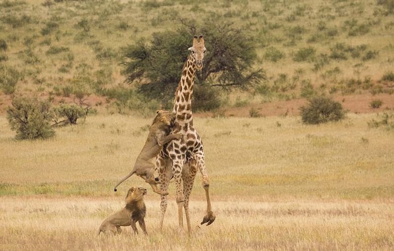 Hươu cao cổ là loại động vật to lớn nhưng bản tính hiền lành. Vì thế khi bị hai con sư tử đực tấn công dữ dội vẫn phải bỏ mạng. Chúng ta hãy xem loạt ảnh sau do nhiếp ảnh gia Vincent Grafhort thực hiện.