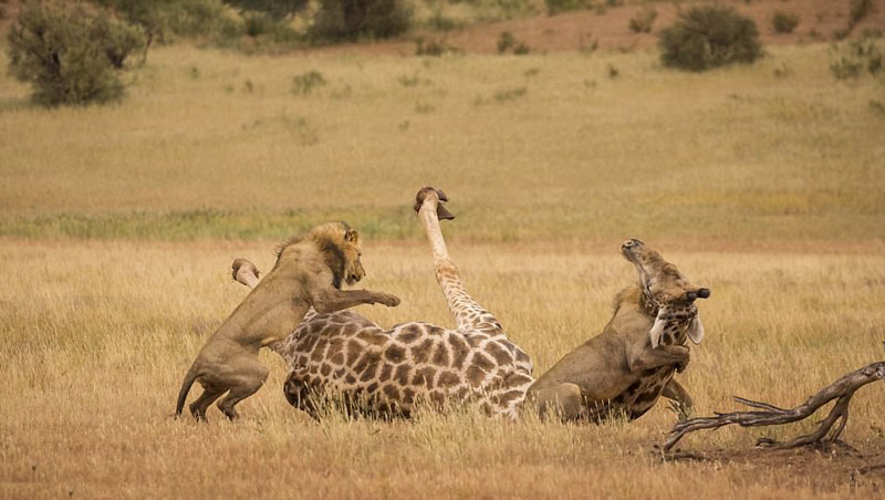 Dù có kiên cường, to lớn tới đâu thì hươu cao cổ cũng phải nộp mạng cho 2 con sư tử đực đói bởi vốn dĩ nó cũng chỉ là động vật ăn cỏ hiền lành.